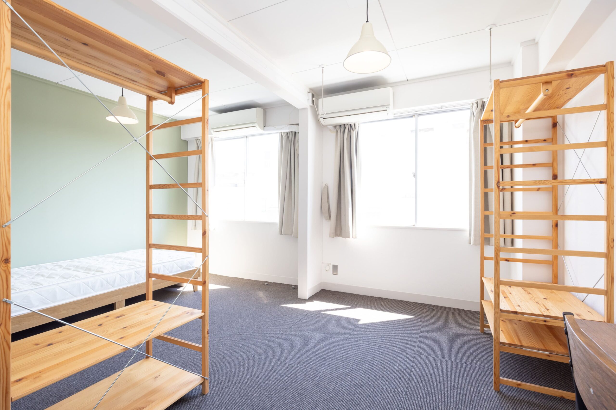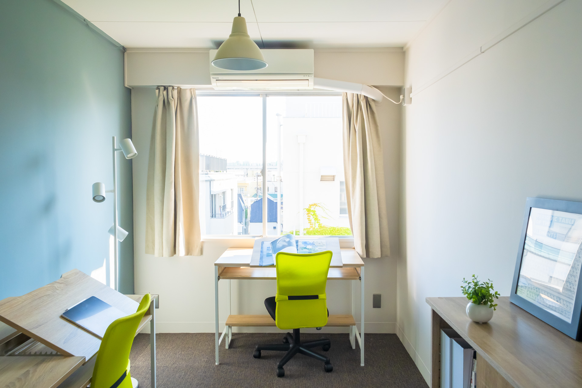 個室はシンプルな作りで、好きなように空間をデザインすることができます。広さは8.3平米(約5畳)、全室エアコン完備です。ユニット型ではないため居室間の防音性は高く、創作活動に集中できる環境です。